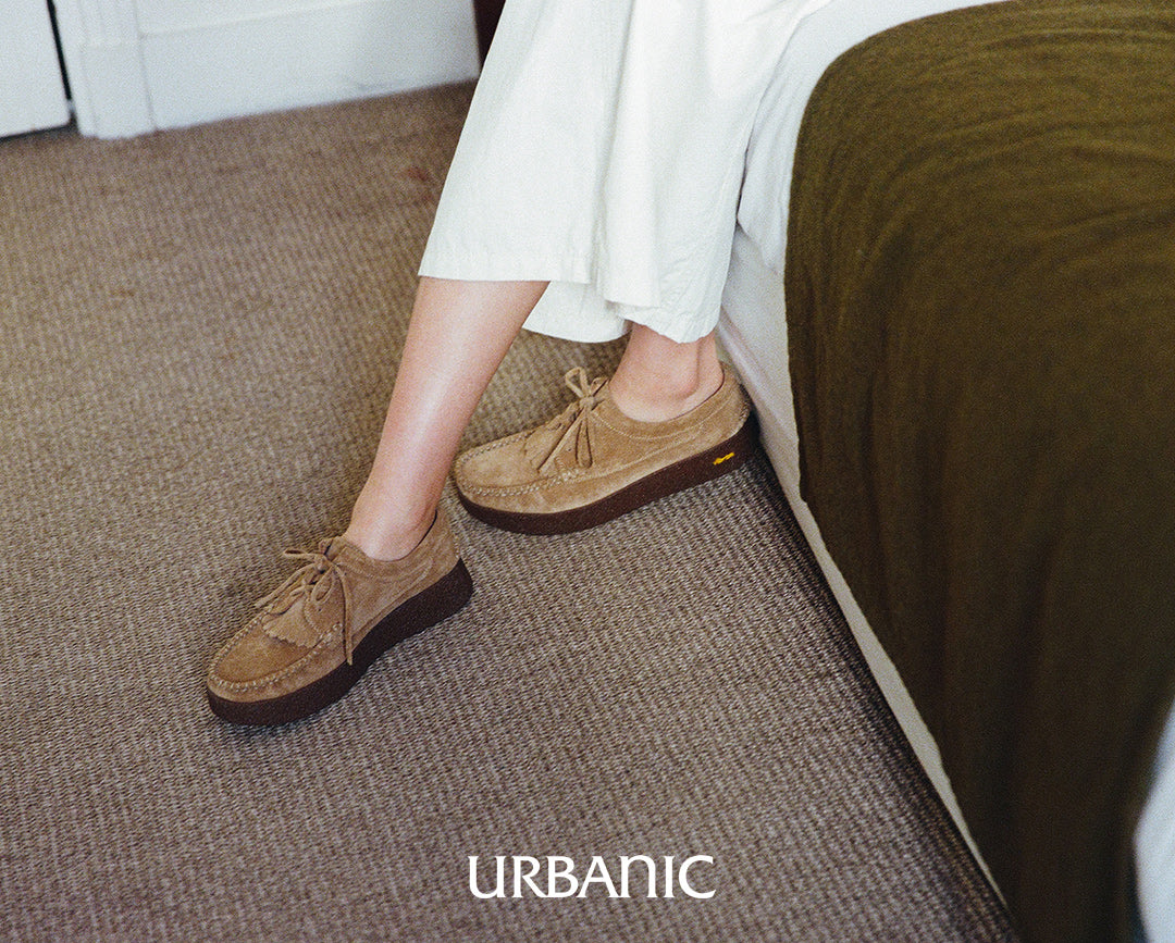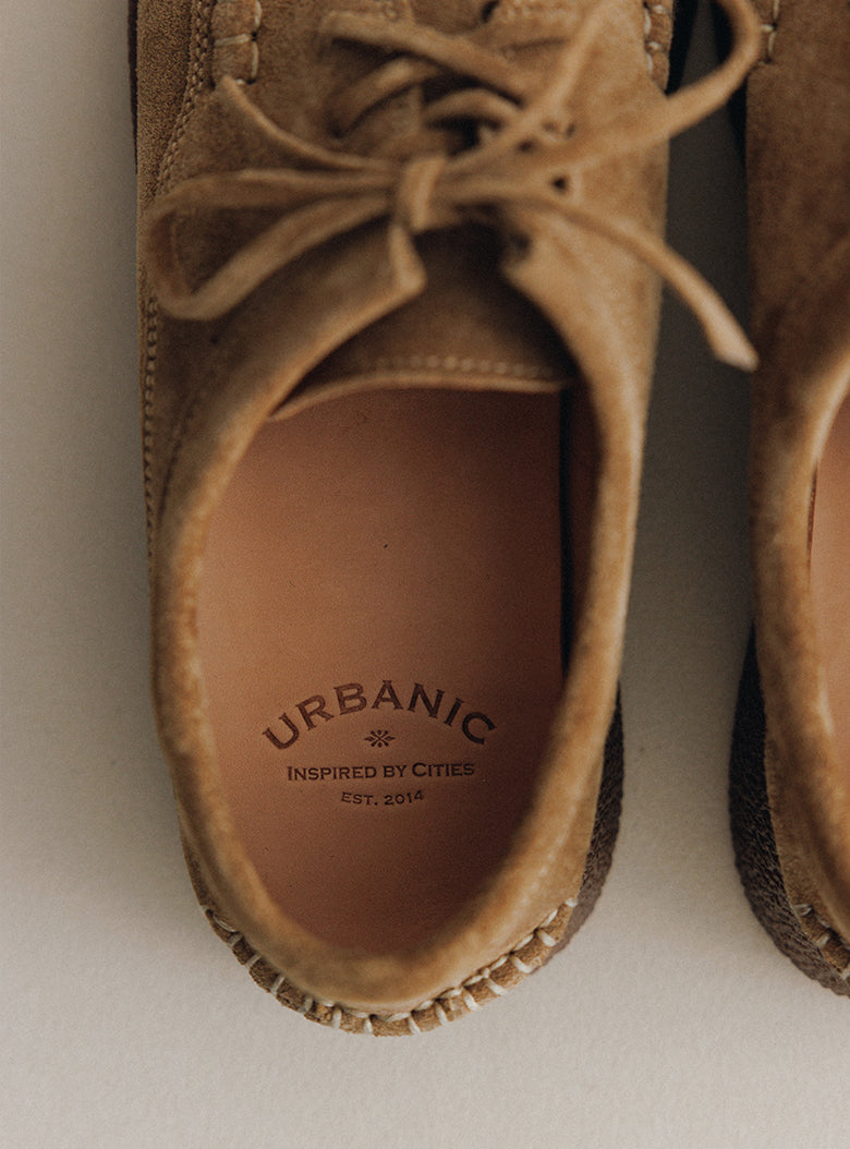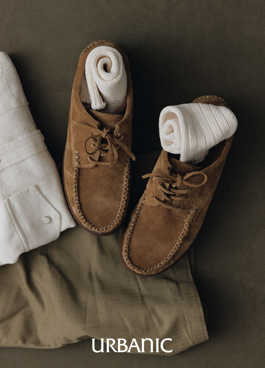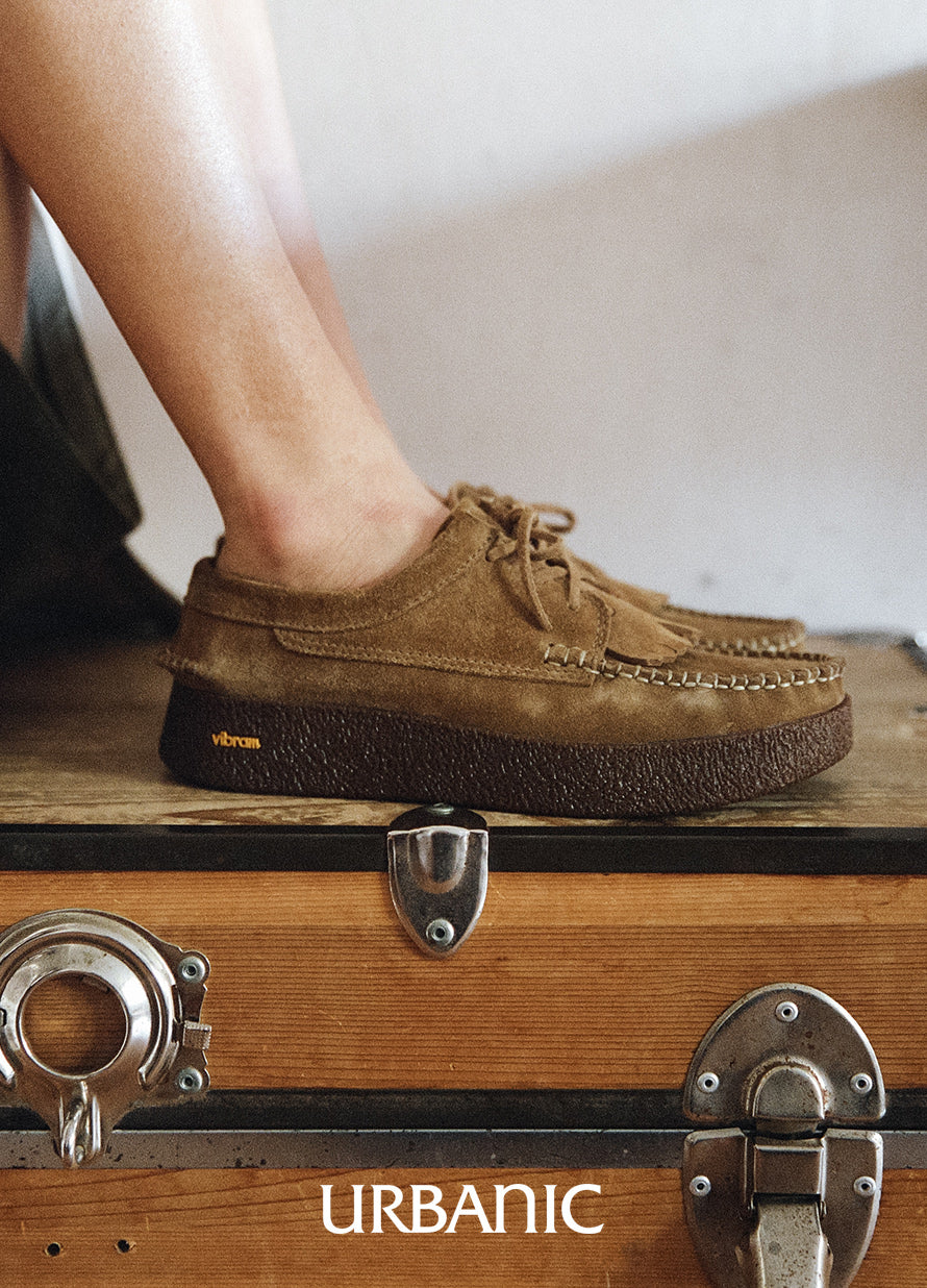 Inspired by the traditional leather footwear of Native North Americans, the Rustic Moccasin blends heritage form with modern function. Built on a classic moccasin silhouette, it features a Vibram crepe outsole for lightweight durability and everyday comfort. Crafted from camel-colored split cowhide, its warm tone and raw texture add a rustic, grounded character—versatile enough for both city streets and quiet escapes.
