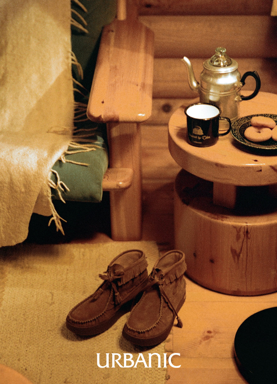 Featuring fringe details around the ankles and hand-stitched accents along the vamp and heel, it captures the humble yet distinctive beauty unique to moccasins.