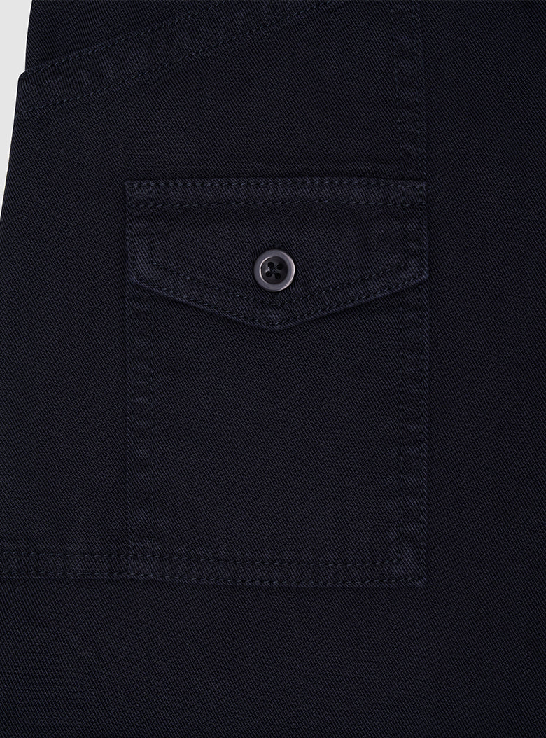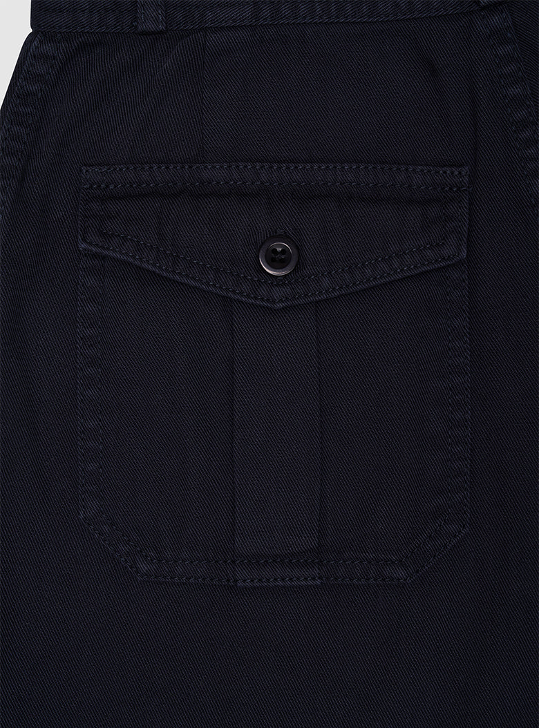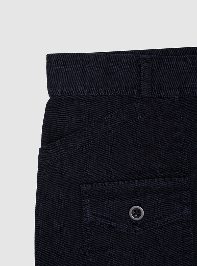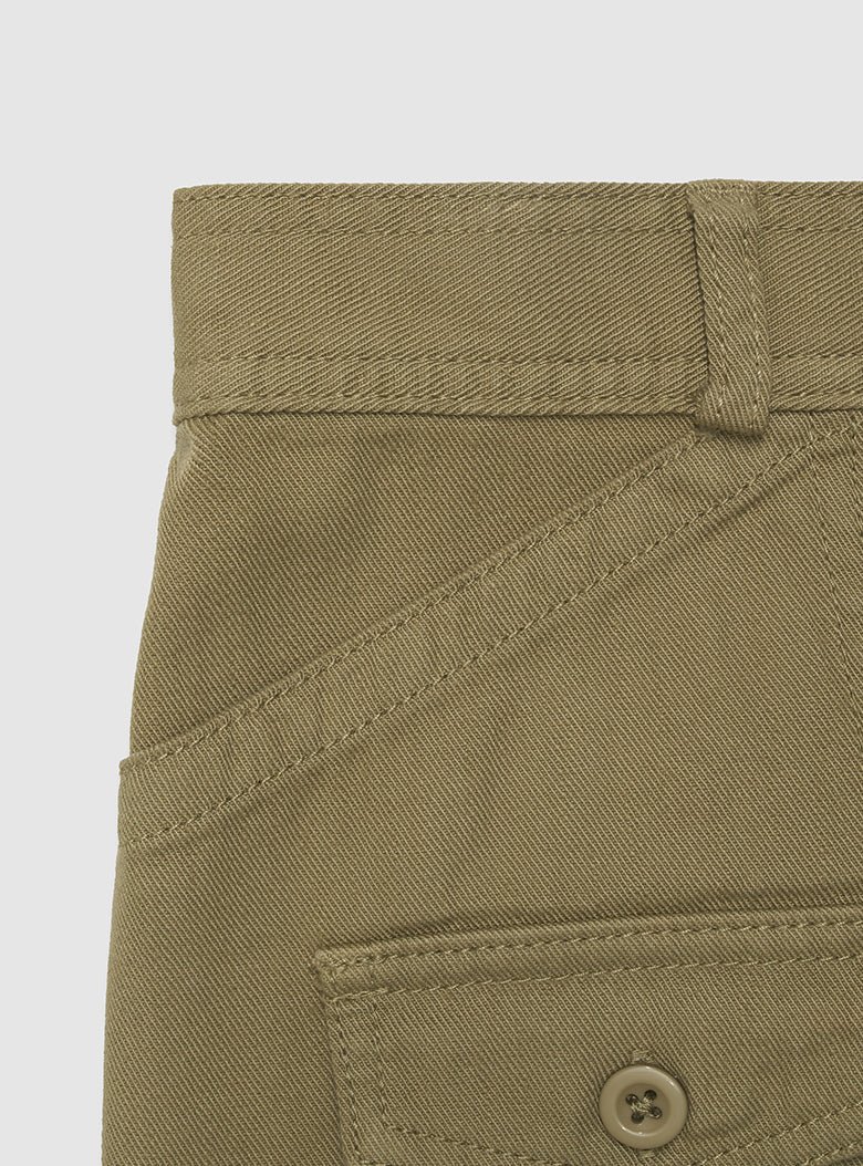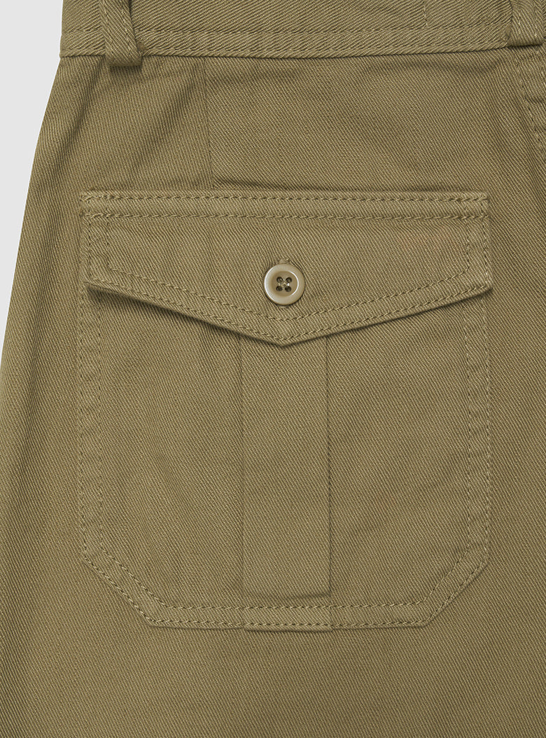 The gently spreading silhouette enhances the leg line with a graceful proportion, while multiple flap patch pockets lend subtle structure and sophistication without visual excess.