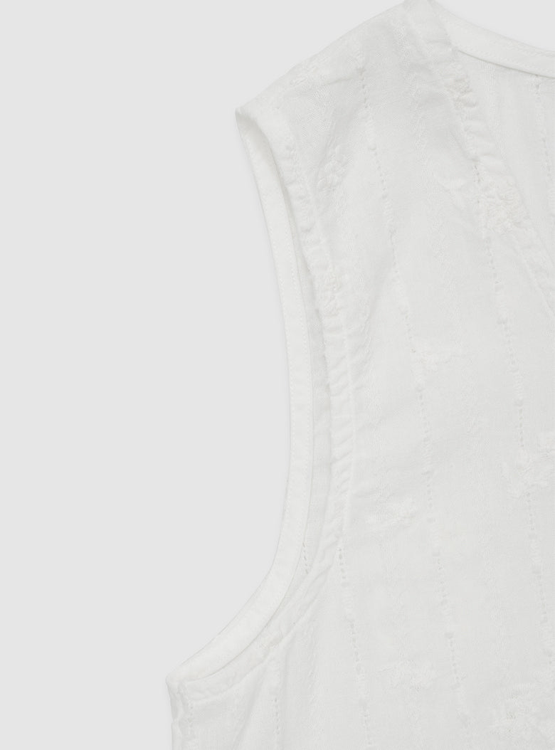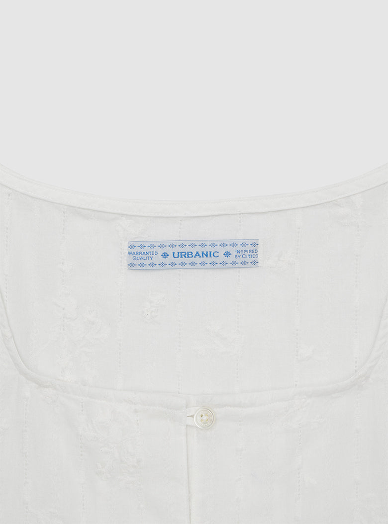 This is the Vines Blouse, which evokes the image of a relaxed and romantic summer getaway. Featuring a square neckline that beautifully highlights the collarbone and armholes with a modest cut, it offers a cool, refreshing feel without being too revealing. It’s a sleeveless top perfect for wearing on its own during the height of summer.